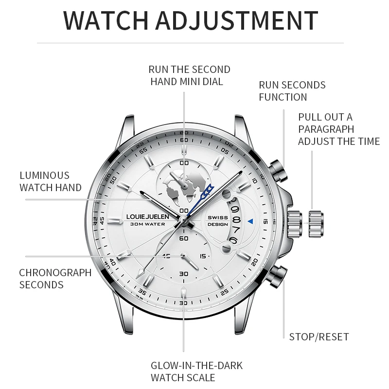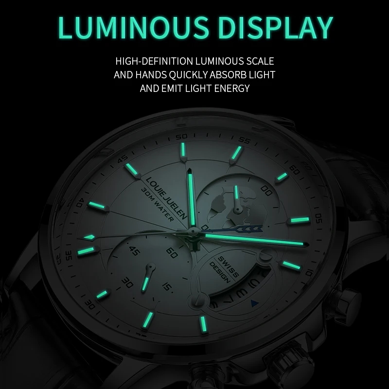 LOUIE JUELEN Swiss Design Fashion Business Man Watch Featuring Genuine Leather Chronograph Men’s Quartz Watch Waterproof Watches